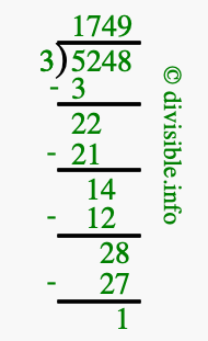 The image displays 1749 at the top, which is the quotient, and 1 at the bottom, which is the remainder. Therefore, the answer to 5248 divided by 3 (5248 ÷ 3) using long division is 1749 remainder 1, or simply 1749 R 1.