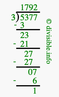 The image displays 1792 at the top, which is the quotient, and 1 at the bottom, which is the remainder. Therefore, the answer to 5377 divided by 3 (5377 ÷ 3) using long division is 1792 remainder 1, or simply 1792 R 1.
