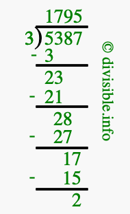 The image displays 1795 at the top, which is the quotient, and 2 at the bottom, which is the remainder. Therefore, the answer to 5387 divided by 3 (5387 ÷ 3) using long division is 1795 remainder 2, or simply 1795 R 2.