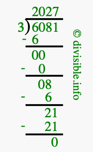 The image displays 2027 at the top, which is the quotient, and 0 at the bottom, which is the remainder. Therefore, the answer to 6081 divided by 3 (6081 ÷ 3) using long division is 2027 remainder 0, or simply 2027 R 0.
