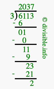 The image displays 2037 at the top, which is the quotient, and 2 at the bottom, which is the remainder. Therefore, the answer to 6113 divided by 3 (6113 ÷ 3) using long division is 2037 remainder 2, or simply 2037 R 2.