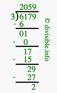 The image displays 2059 at the top, which is the quotient, and 2 at the bottom, which is the remainder. Therefore, the answer to 6179 divided by 3 (6179 ÷ 3) using long division is 2059 remainder 2, or simply 2059 R 2.