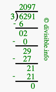 The image displays 2097 at the top, which is the quotient, and 0 at the bottom, which is the remainder. Therefore, the answer to 6291 divided by 3 (6291 ÷ 3) using long division is 2097 remainder 0, or simply 2097 R 0.