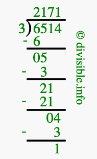 The image displays 2171 at the top, which is the quotient, and 1 at the bottom, which is the remainder. Therefore, the answer to 6514 divided by 3 (6514 ÷ 3) using long division is 2171 remainder 1, or simply 2171 R 1.