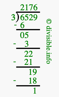 The image displays 2176 at the top, which is the quotient, and 1 at the bottom, which is the remainder. Therefore, the answer to 6529 divided by 3 (6529 ÷ 3) using long division is 2176 remainder 1, or simply 2176 R 1.