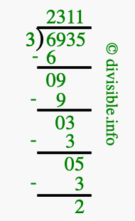 Here we will show you an image that illustrates how to calculate 6935 divided by 3 using long division. We will also give you the answer to 6935 divided by 3 (6935 ÷ 3) as a fraction and as a decimal.