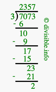 The image displays 2357 at the top, which is the quotient, and 2 at the bottom, which is the remainder. Therefore, the answer to 7073 divided by 3 (7073 ÷ 3) using long division is 2357 remainder 2, or simply 2357 R 2.