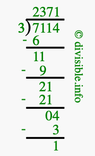 The image displays 2371 at the top, which is the quotient, and 1 at the bottom, which is the remainder. Therefore, the answer to 7114 divided by 3 (7114 ÷ 3) using long division is 2371 remainder 1, or simply 2371 R 1.