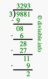 The image displays 3293 at the top, which is the quotient, and 2 at the bottom, which is the remainder. Therefore, the answer to 9881 divided by 3 (9881 ÷ 3) using long division is 3293 remainder 2, or simply 3293 R 2.