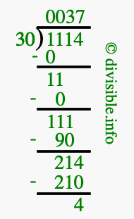 The image displays 37 at the top, which is the quotient, and 4 at the bottom, which is the remainder. Therefore, the answer to 1114 divided by 30 (1114 ÷ 30) using long division is 37 remainder 4, or simply 37 R 4.