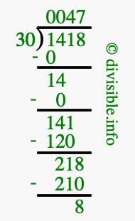 The image displays 47 at the top, which is the quotient, and 8 at the bottom, which is the remainder. Therefore, the answer to 1418 divided by 30 (1418 ÷ 30) using long division is 47 remainder 8, or simply 47 R 8.