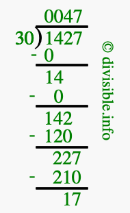 The image displays 47 at the top, which is the quotient, and 17 at the bottom, which is the remainder. Therefore, the answer to 1427 divided by 30 (1427 ÷ 30) using long division is 47 remainder 17, or simply 47 R 17.