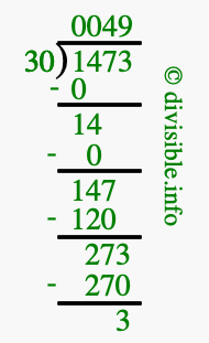 Here we will show you an image that illustrates how to calculate 1473 divided by 30 using long division. We will also give you the answer to 1473 divided by 30 (1473 ÷ 30) as a fraction and as a decimal.