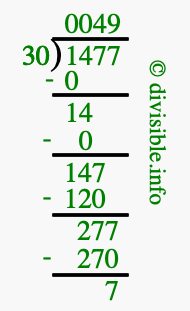 The image displays 49 at the top, which is the quotient, and 7 at the bottom, which is the remainder. Therefore, the answer to 1477 divided by 30 (1477 ÷ 30) using long division is 49 remainder 7, or simply 49 R 7.