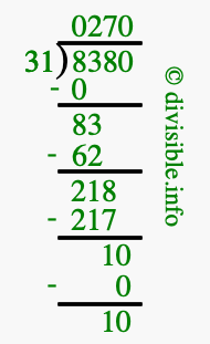 The image displays 270 at the top, which is the quotient, and 10 at the bottom, which is the remainder. Therefore, the answer to 8380 divided by 31 (8380 ÷ 31) using long division is 270 remainder 10, or simply 270 R 10.
