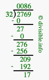The image displays 86 at the top, which is the quotient, and 17 at the bottom, which is the remainder. Therefore, the answer to 2769 divided by 32 (2769 ÷ 32) using long division is 86 remainder 17, or simply 86 R 17.