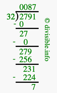 The image displays 87 at the top, which is the quotient, and 7 at the bottom, which is the remainder. Therefore, the answer to 2791 divided by 32 (2791 ÷ 32) using long division is 87 remainder 7, or simply 87 R 7.
