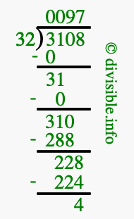 The image displays 97 at the top, which is the quotient, and 4 at the bottom, which is the remainder. Therefore, the answer to 3108 divided by 32 (3108 ÷ 32) using long division is 97 remainder 4, or simply 97 R 4.