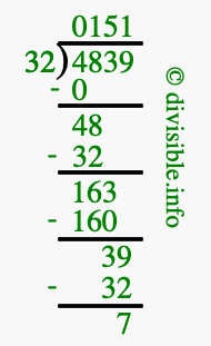 The image displays 151 at the top, which is the quotient, and 7 at the bottom, which is the remainder. Therefore, the answer to 4839 divided by 32 (4839 ÷ 32) using long division is 151 remainder 7, or simply 151 R 7.
