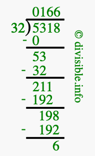 The image displays 166 at the top, which is the quotient, and 6 at the bottom, which is the remainder. Therefore, the answer to 5318 divided by 32 (5318 ÷ 32) using long division is 166 remainder 6, or simply 166 R 6.