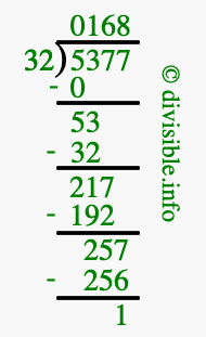 The image displays 168 at the top, which is the quotient, and 1 at the bottom, which is the remainder. Therefore, the answer to 5377 divided by 32 (5377 ÷ 32) using long division is 168 remainder 1, or simply 168 R 1.