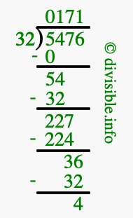 Here we will show you an image that illustrates how to calculate 5476 divided by 32 using long division. We will also give you the answer to 5476 divided by 32 (5476 ÷ 32) as a fraction and as a decimal.