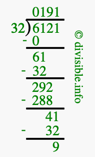 The image displays 191 at the top, which is the quotient, and 9 at the bottom, which is the remainder. Therefore, the answer to 6121 divided by 32 (6121 ÷ 32) using long division is 191 remainder 9, or simply 191 R 9.