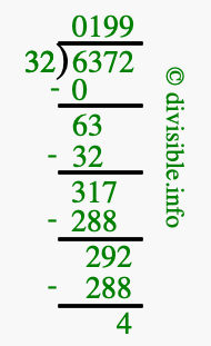 The image displays 199 at the top, which is the quotient, and 4 at the bottom, which is the remainder. Therefore, the answer to 6372 divided by 32 (6372 ÷ 32) using long division is 199 remainder 4, or simply 199 R 4.
