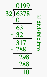 The image displays 199 at the top, which is the quotient, and 10 at the bottom, which is the remainder. Therefore, the answer to 6378 divided by 32 (6378 ÷ 32) using long division is 199 remainder 10, or simply 199 R 10.