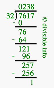 Here we will show you an image that illustrates how to calculate 7617 divided by 32 using long division. We will also give you the answer to 7617 divided by 32 (7617 ÷ 32) as a fraction and as a decimal.
