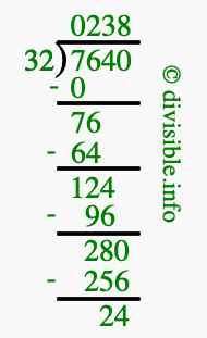 Here we will show you an image that illustrates how to calculate 7640 divided by 32 using long division. We will also give you the answer to 7640 divided by 32 (7640 ÷ 32) as a fraction and as a decimal.