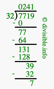 Here we will show you an image that illustrates how to calculate 7719 divided by 32 using long division. We will also give you the answer to 7719 divided by 32 (7719 ÷ 32) as a fraction and as a decimal.