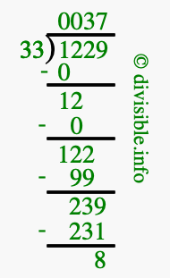 Here we will show you an image that illustrates how to calculate 1229 divided by 33 using long division. We will also give you the answer to 1229 divided by 33 (1229 ÷ 33) as a fraction and as a decimal.