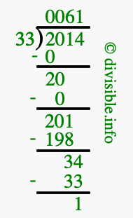The image displays 61 at the top, which is the quotient, and 1 at the bottom, which is the remainder. Therefore, the answer to 2014 divided by 33 (2014 ÷ 33) using long division is 61 remainder 1, or simply 61 R 1.