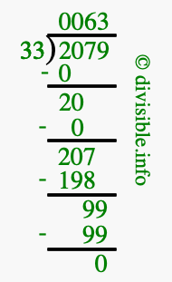 The image displays 63 at the top, which is the quotient, and 0 at the bottom, which is the remainder. Therefore, the answer to 2079 divided by 33 (2079 ÷ 33) using long division is 63 remainder 0, or simply 63 R 0.