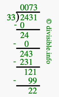 The image displays 73 at the top, which is the quotient, and 22 at the bottom, which is the remainder. Therefore, the answer to 2431 divided by 33 (2431 ÷ 33) using long division is 73 remainder 22, or simply 73 R 22.