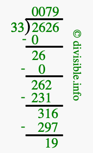 Here we will show you an image that illustrates how to calculate 2626 divided by 33 using long division. We will also give you the answer to 2626 divided by 33 (2626 ÷ 33) as a fraction and as a decimal.