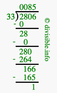 The image displays 85 at the top, which is the quotient, and 1 at the bottom, which is the remainder. Therefore, the answer to 2806 divided by 33 (2806 ÷ 33) using long division is 85 remainder 1, or simply 85 R 1.