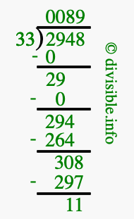 The image displays 89 at the top, which is the quotient, and 11 at the bottom, which is the remainder. Therefore, the answer to 2948 divided by 33 (2948 ÷ 33) using long division is 89 remainder 11, or simply 89 R 11.
