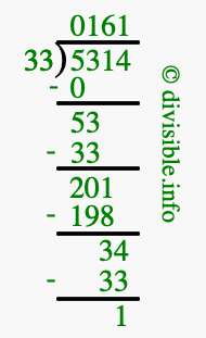 The image displays 161 at the top, which is the quotient, and 1 at the bottom, which is the remainder. Therefore, the answer to 5314 divided by 33 (5314 ÷ 33) using long division is 161 remainder 1, or simply 161 R 1.