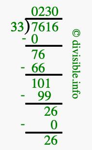 The image displays 230 at the top, which is the quotient, and 26 at the bottom, which is the remainder. Therefore, the answer to 7616 divided by 33 (7616 ÷ 33) using long division is 230 remainder 26, or simply 230 R 26.