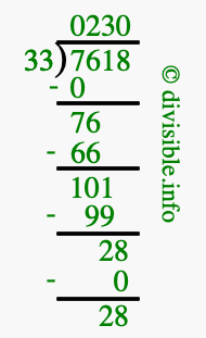 The image displays 230 at the top, which is the quotient, and 28 at the bottom, which is the remainder. Therefore, the answer to 7618 divided by 33 (7618 ÷ 33) using long division is 230 remainder 28, or simply 230 R 28.