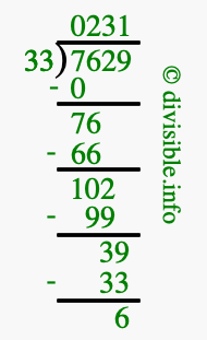 The image displays 231 at the top, which is the quotient, and 6 at the bottom, which is the remainder. Therefore, the answer to 7629 divided by 33 (7629 ÷ 33) using long division is 231 remainder 6, or simply 231 R 6.