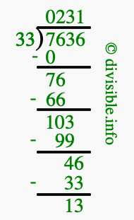 The image displays 231 at the top, which is the quotient, and 13 at the bottom, which is the remainder. Therefore, the answer to 7636 divided by 33 (7636 ÷ 33) using long division is 231 remainder 13, or simply 231 R 13.