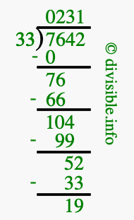 The image displays 231 at the top, which is the quotient, and 19 at the bottom, which is the remainder. Therefore, the answer to 7642 divided by 33 (7642 ÷ 33) using long division is 231 remainder 19, or simply 231 R 19.