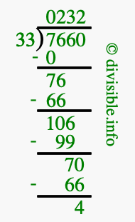 The image displays 232 at the top, which is the quotient, and 4 at the bottom, which is the remainder. Therefore, the answer to 7660 divided by 33 (7660 ÷ 33) using long division is 232 remainder 4, or simply 232 R 4.