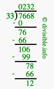 The image displays 232 at the top, which is the quotient, and 12 at the bottom, which is the remainder. Therefore, the answer to 7668 divided by 33 (7668 ÷ 33) using long division is 232 remainder 12, or simply 232 R 12.