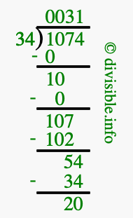 The image displays 31 at the top, which is the quotient, and 20 at the bottom, which is the remainder. Therefore, the answer to 1074 divided by 34 (1074 ÷ 34) using long division is 31 remainder 20, or simply 31 R 20.