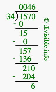 The image displays 46 at the top, which is the quotient, and 6 at the bottom, which is the remainder. Therefore, the answer to 1570 divided by 34 (1570 ÷ 34) using long division is 46 remainder 6, or simply 46 R 6.