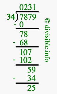 The image displays 231 at the top, which is the quotient, and 25 at the bottom, which is the remainder. Therefore, the answer to 7879 divided by 34 (7879 ÷ 34) using long division is 231 remainder 25, or simply 231 R 25.